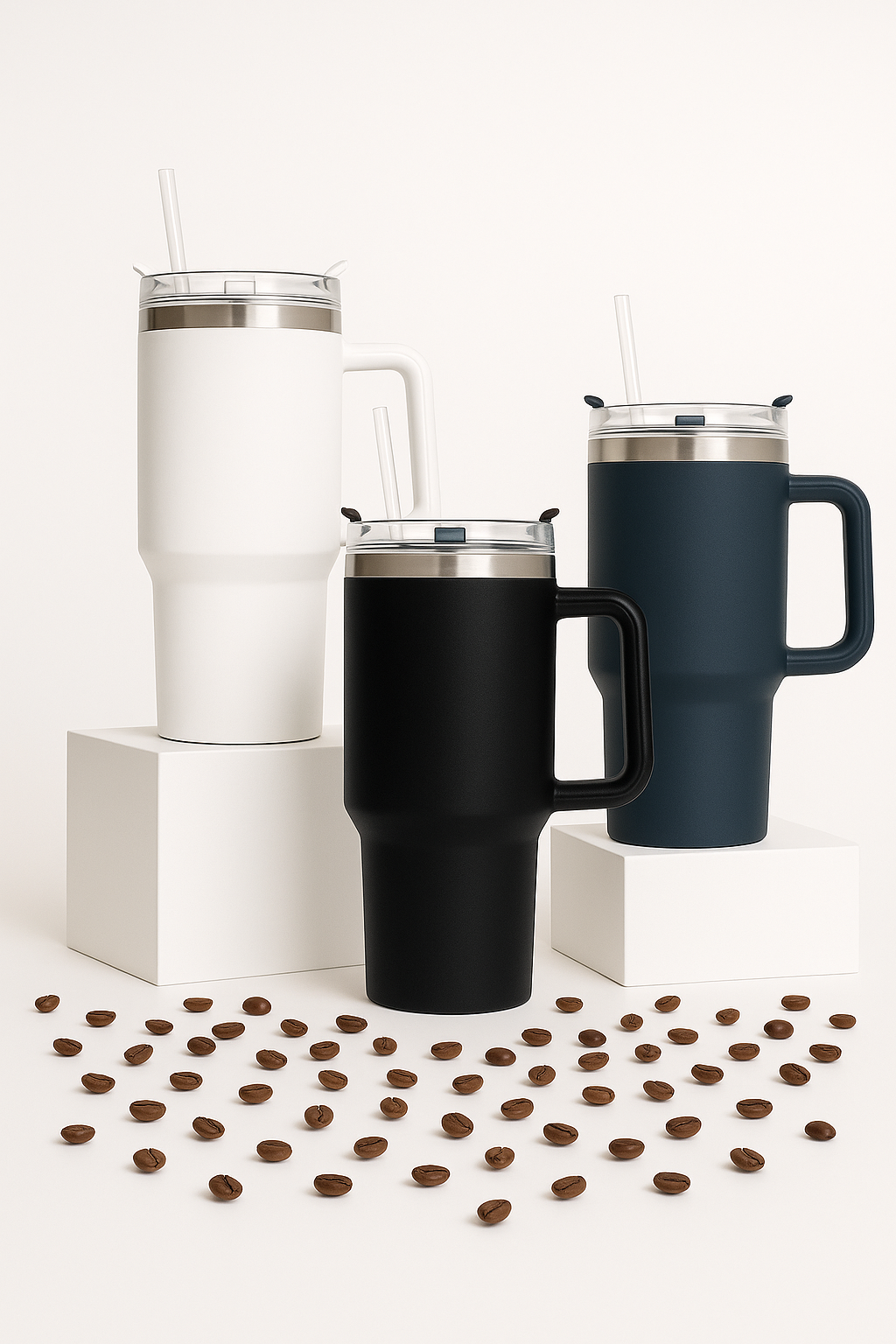 40 Oz tumbler, ergonomic handle, 2-in-1 lid, and reusable straw included.
